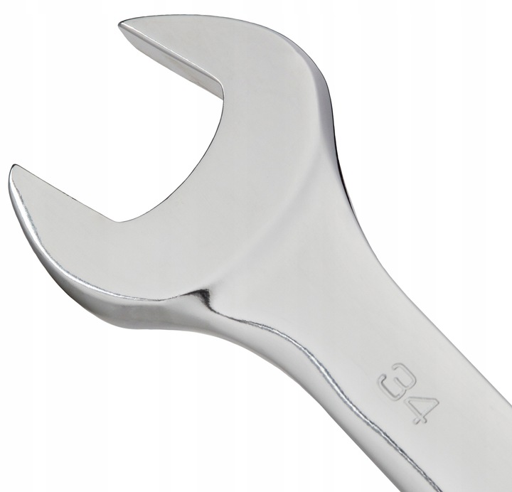 Solidny klucz płasko oczkowy 34 mm wykonany ze stali CrV z satynowym wykończeniem, minimalizującym poślizg ręki operatora w przypadku zabrudzenia klucza olejem.