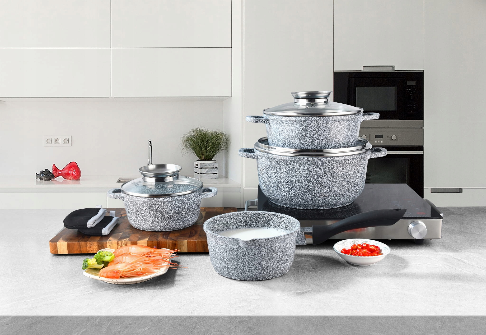 Komplet garnków marmurowych garnki zestaw indukcja gaz garnki premium 9el