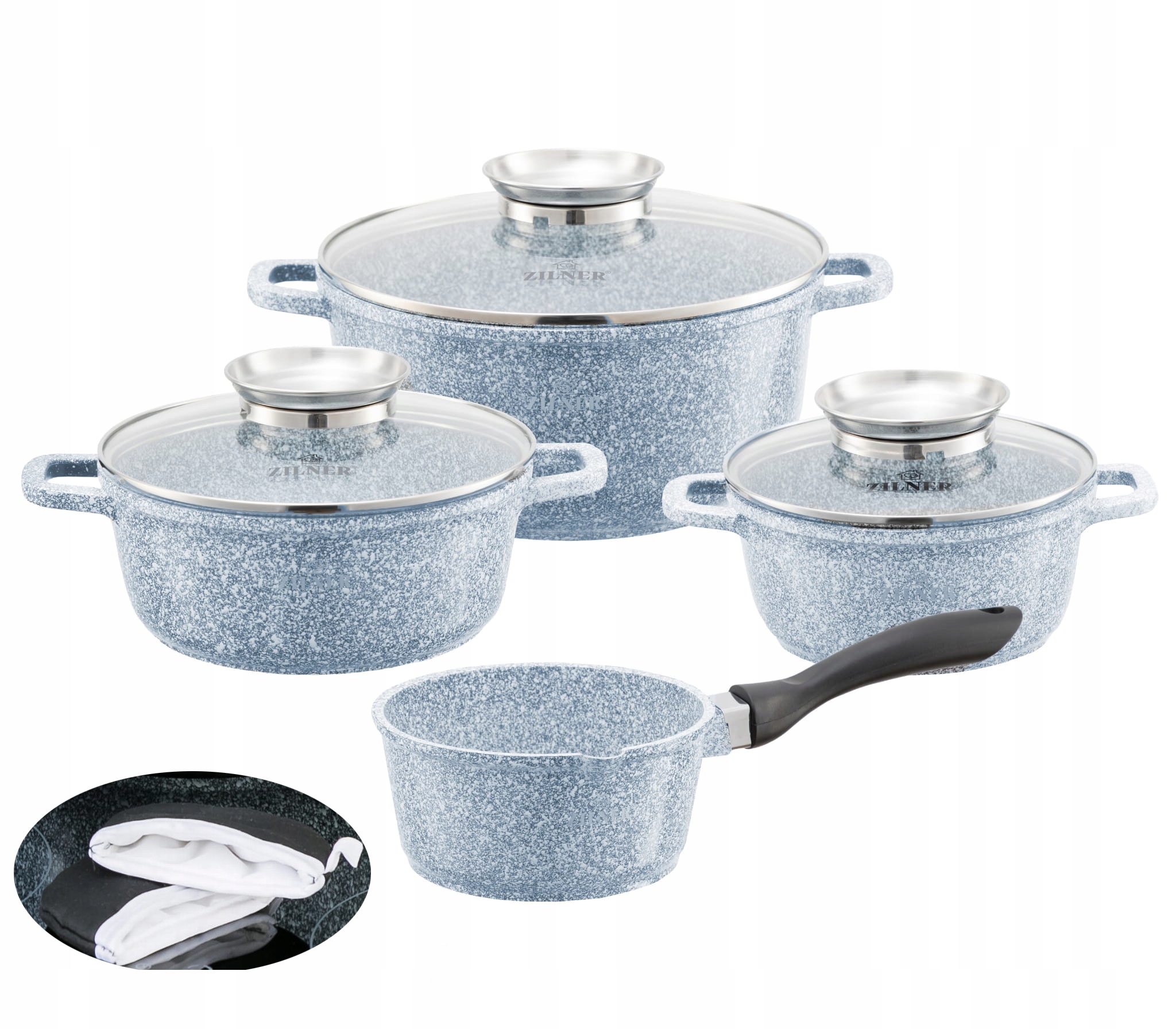- Komplet funkcjonalnych i poręcznych garnków to podstawa każdego dobrze wyposażonego wnętrza kuchennego. Zróżnicowana pojemność i rozmaity kształt naczyń umożliwia swobodne i przyjemne przyrządzanie potraw dla całej rodziny. Mały rondelek bez problemu poradzi sobie z przygotowaniem wykwintnego sosu, zaś pojemny i wysoki garnek świetnie sprawdzi się podczas gotowania zupy lub przyrządzania dania jednogarnkowego. W celu zapewnienia przyjemnego i oszczędnego przygotowywania potraw dla całej rodziny powstał zestaw 9-częściowy ceramiczno-marmurowy ZILNER ZL-7076.