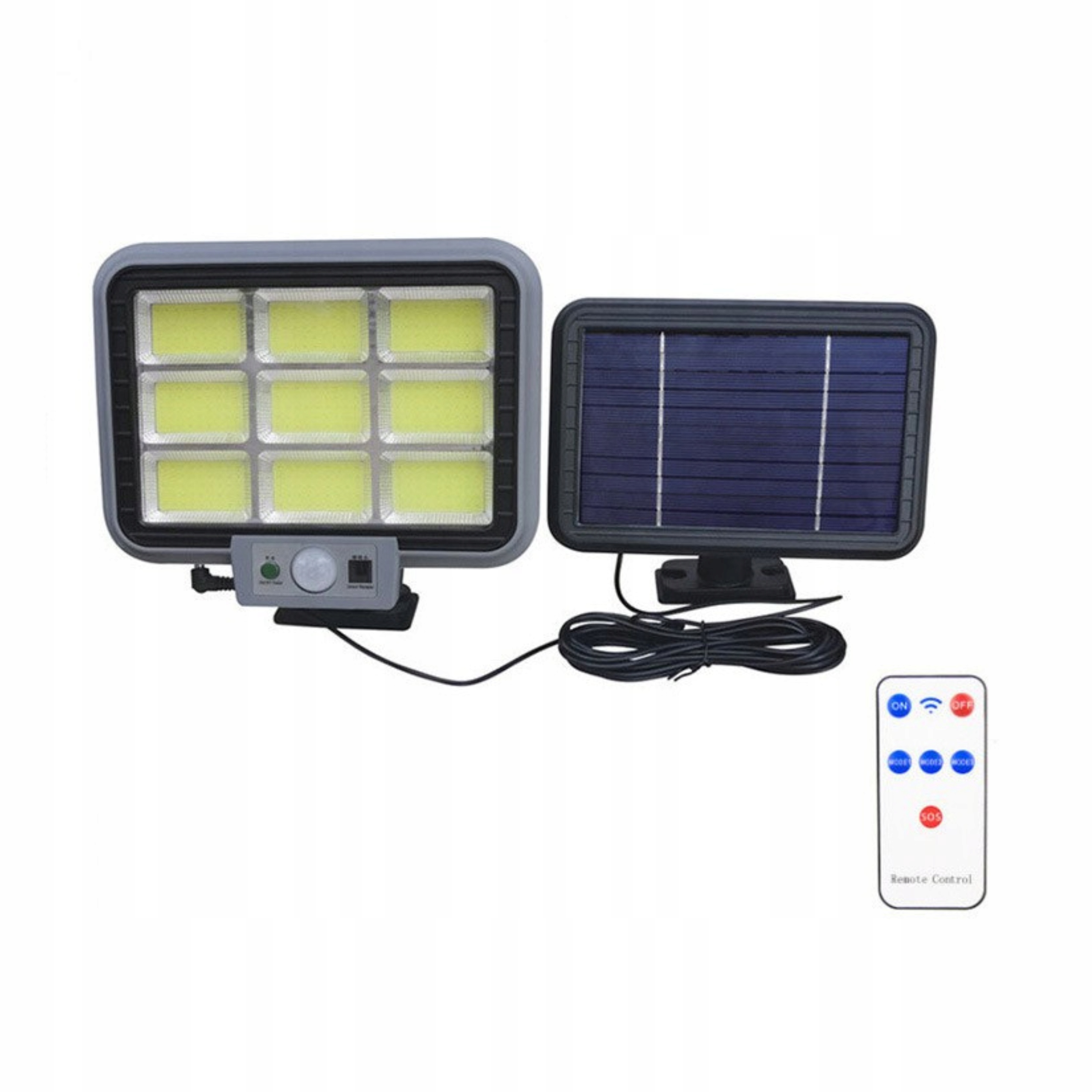 Lampa solarna ścienna led COB z 3 trybami pracy, posiada pilota zdalnego sterowania oraz czujnik ruchu i zmierzchu, IP65 jest wodoodporna. Lampa słoneczna idealna przed dom, do oświetlenia drzwi wejściowych, furtki, ściany domu itp. Moduły led COB mają znacznie lepszą wydajność w porównaniu do tradycyjnych diod.