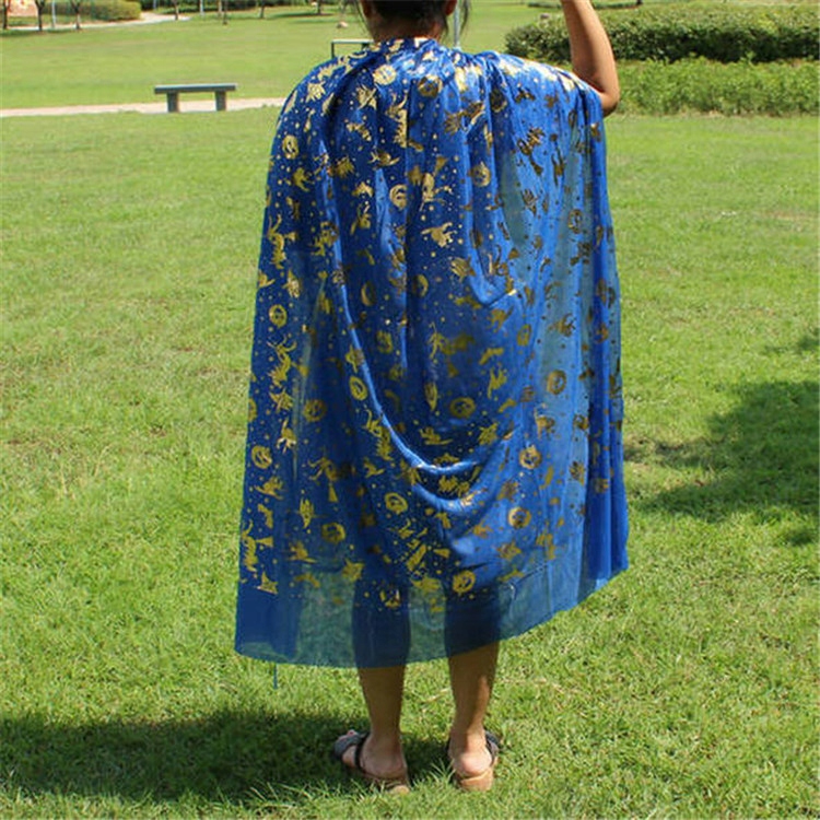 - Magiczny wzór: Niebieska peleryna z eleganckimi złotymi symbolami (księżyce, gwiazdy, smoki) przyciąga wzrok i dodaje magii każdej stylizacji.