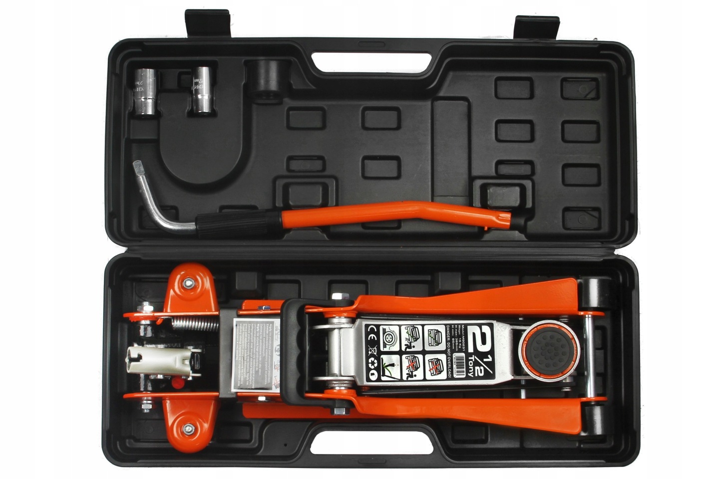 Podnośnik niskoprofilowy w zestawie z walizką, dwoma gumami, rączką dwufunkcyjną oraz nasadkami.