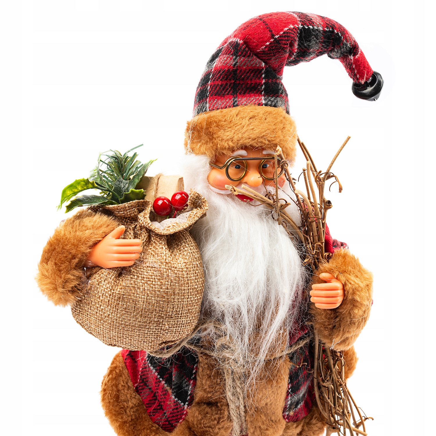 - realistycznie wykonany z dbałością o każdy szczegół – broda, okulary, worek z prezentami i gałązki,