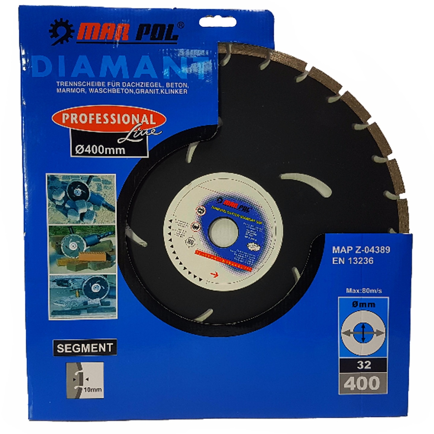 Profesjonalna tarcza diamentowa, segmentowa marki MAR-POL służy do cięcia twardych materiałów budowlanych. Specjalny kształt obrzeża tarczy diamentowej gwarantuje większą szybkość cięcia w najtwardszych materiałach bez utraty jakości wykończenia.  W zestawie otrzymają Państwo o-ring do zmniejszenia średnicy wewnętrznej. Przeznaczona do pracy na sucho za pomocą szlifierek kątowych. Można używać jej do cięcia betonu, cegły, płytki ceramicznej, klinkieru, kostki brukowej. Tarcza posiada ostrze segmentowe, które ułatwia usuwanie urobku oraz pozwala na łatwą pracę w twardym, agresywny podłożu. Tarcze MAR-POL stanowią najlepszy wybór podczas najbardziej wymagających prac. Tarcza do cięcia na sucho i jak i na mokro.