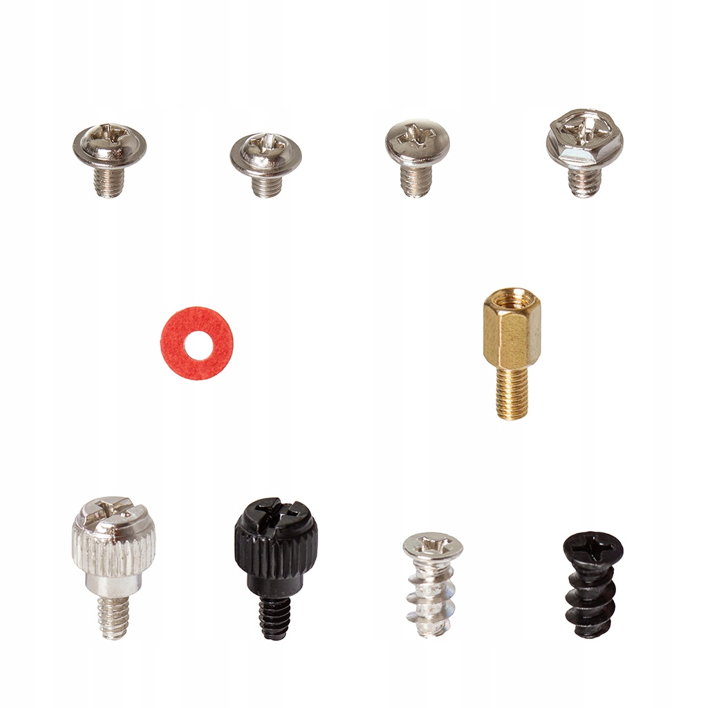 Zestaw śrub komputerowych w różnych rozmiarach, zapewniających wystarczającą ilość zamienników, aby spełnić Twoje
